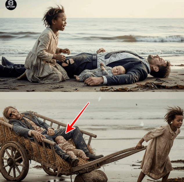 Anna’s arms ached from pulling, but she didn’t dare stop. The wagon creaked. The rusted wheels clattered against shells and broken wood as she dragged the unconscious man up the dune path. The baby lay swaddled in a damp towel beside him, unmoving, silent. Every few steps, she looked down, hoping for some flicker of life. None came. Her chest felt tight. She told herself she was only moving them to get them off the beach, away from the tide. That was all. But a small, stubborn voice inside whispered something else.